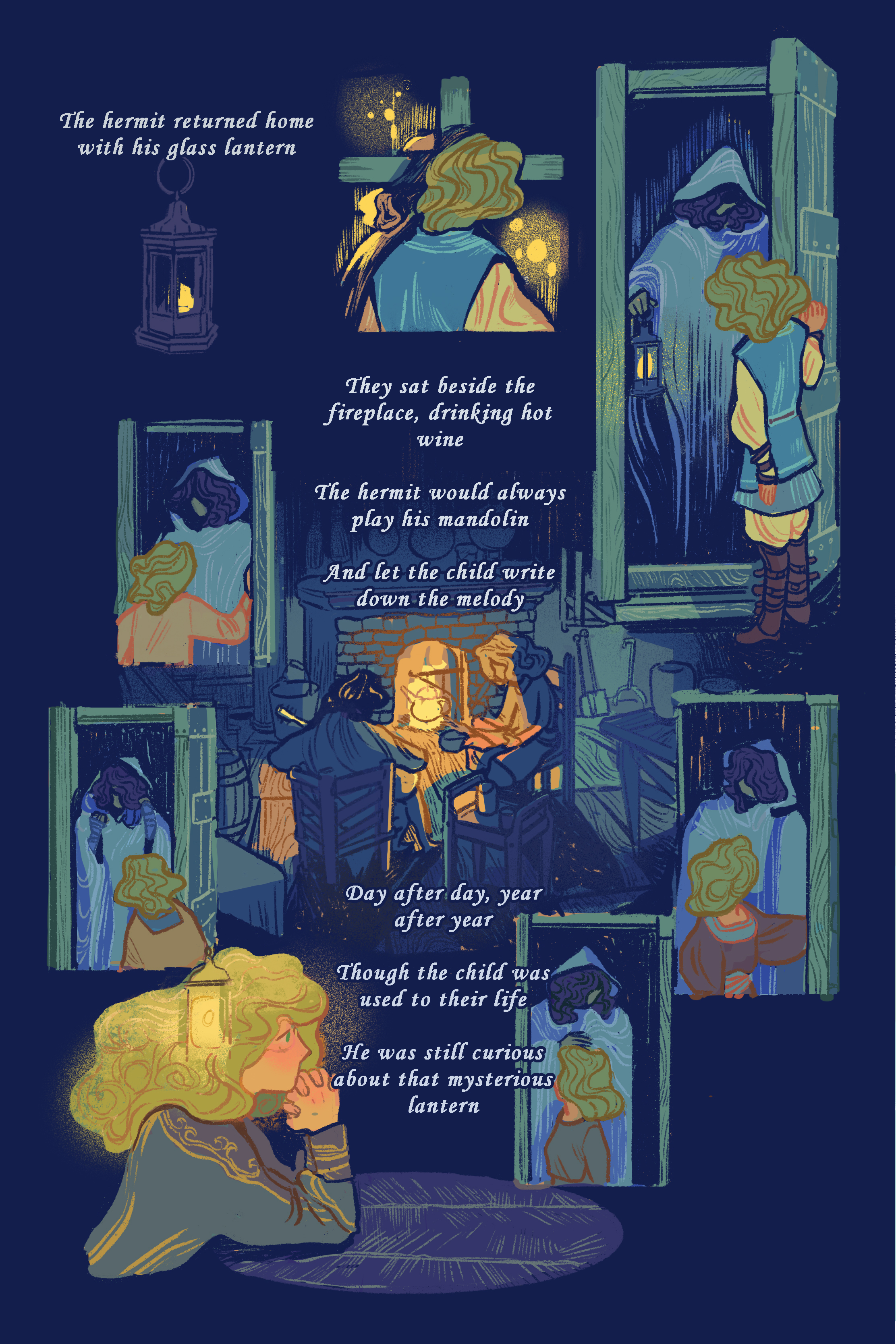 The lonely hermit created a loop where he will countinusly meet, raise, be loved, and be left by the child with star bottle.